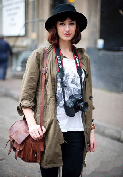文藝女青年的標(biāo)志裝扮,休閑隨意的風(fēng)衣外套,干練的郵差包,黑色寬檐帽顯得整個(gè)人都精神十足。 www.hzyichun.com 帽子工廠(chǎng)