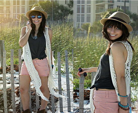 比起遮陽帽,這款俏皮草編帽在不羈的裝扮襯托下更顯得額外自然、休閑。粉色系的牛仔熱褲又在這份不羈中增添了些許的甜蜜感。