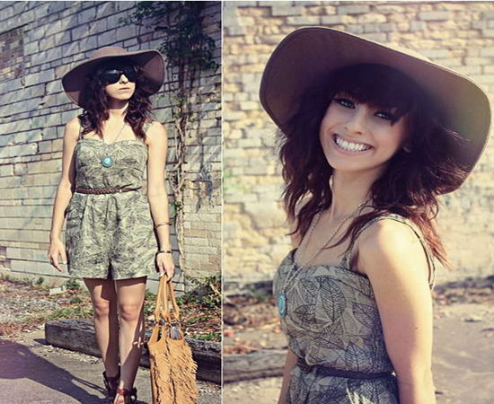 復(fù)古款的吊帶裙與大檐帽的組合堪稱經(jīng)典,同樣的復(fù)古韻味卻帶出了意想不到的摩登感。有著神奇瘦臉作用的復(fù)古大檐帽,為整體造型增添了一份濃濃的假日休閑感。同色系的腰帶搭配厚底涼鞋,加強了造型的整體感。