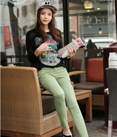 灰色梨形針織帽&藏青色毛衣外套&糖果色緊褲整體服飾搭配風(fēng)格比較休閑個(gè)性風(fēng),毛衣外套是春季的基本款服飾,內(nèi)搭淺色tee,下穿鵝黃色緊身褲,超級(jí)清新風(fēng)的街頭裝扮