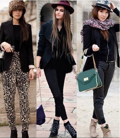 2011年的T臺上開始大肆流行動物的圖案,豹紋作為經(jīng)久不衰的元素,被無數(shù)人傳唱出美麗的傳說,這位街拍達人可以說是十足的豹紋控!簡約的黑色西裝如果沒有豹紋哈倫褲的襯托,一定是沉悶且毫無生氣的,不甘寂寞的豹紋元素又出現(xiàn)在帽子上,簡潔緊實的設(shè)計,令模特的頭部造型看起來十分的精致大方,模特在兩個單品上同時選擇豹紋,卻沒有感到一絲的凌亂和眩暈,利用黑色將其分層,更感覺層次之間的遞進落落有致。
