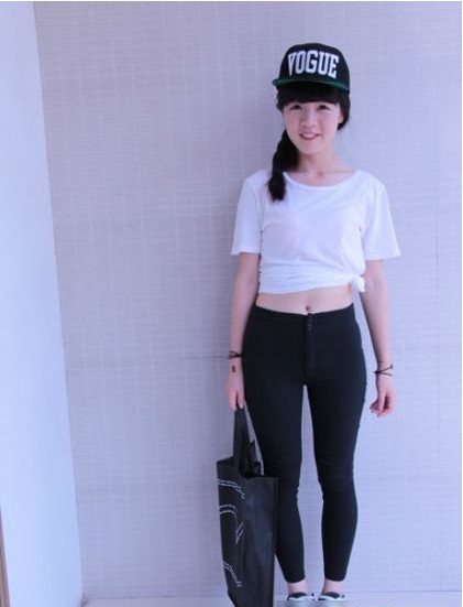 白色T恤的綁腰設(shè)計(jì)小路蠻腰,美眉甜蜜的臉龐加上一頂帥氣的春秋5片帽非常加分噢!