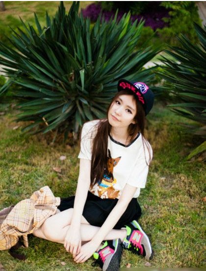 白色動(dòng)物T恤搭配玄色運(yùn)動(dòng)短褲干凈舒服,非常合適美眉青春的臉龐,加上字母春秋5片帽和運(yùn)動(dòng)球鞋增加帥氣的感覺(jué),青春的活力無(wú)法阻擋。