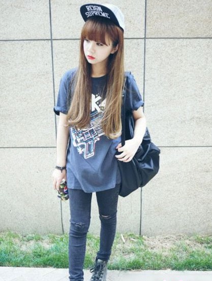 boyfriend風(fēng)的T恤搭配鉛筆褲平凡簡(jiǎn)單,加上一定春秋5片帽呼應(yīng)了T恤的涂鴉圖案,布滿(mǎn)街頭氣味,這樣街頭范的妝容穿在甜蜜可愛(ài)的金發(fā)小妞身上別有一番風(fēng)味。
