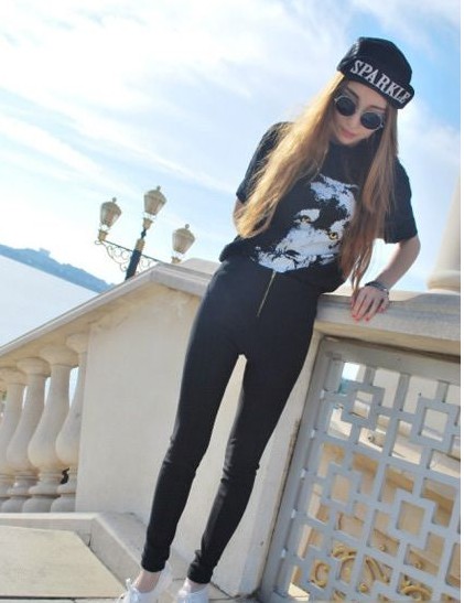 美眉一身玄色動(dòng)物T恤搭配玄色鉛筆褲妝容神秘帥氣,褲頭束腰展現(xiàn)超長(zhǎng)美腿,一頂少女時(shí)代風(fēng)的春秋5片帽讓妝容更加靚麗,復(fù)古圓框的太陽(yáng)眼鏡讓妝容更加時(shí)髦。