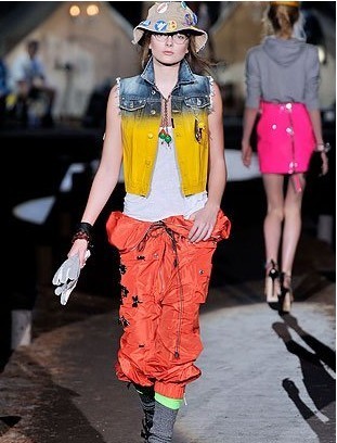 被染過色的牛仔馬甲看起來更加清新,普通的漁夫帽上貼滿了大小不等的標(biāo)牌,結(jié)合隨性的橘紅色長褲簡直就是釣魚時最好的時髦裝扮,當(dāng)然出于實用角度考慮高跟鞋就免了,橡膠材質(zhì)的水鞋應(yīng)該很應(yīng)景