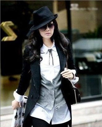 搭配Tips:全黑色禮帽酷勁十足,小編建議西裝搭配比較女人味的襯衫,像是蕾絲襯衫、有蝴蝶結(jié)設(shè)計(jì)的襯衫都能隱隱透露女人味,若隱若現(xiàn)的才更吸引人!
