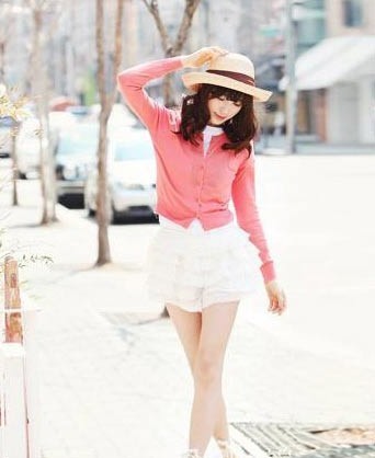 姜黃色寬沿草帽是可愛少女首選,與甜美風服飾是最佳拍檔。白色連衣裙、粉紅色針織外套休閑又甜美,舉手投足間透露出親和力。