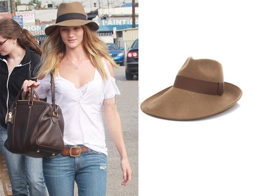 Rosie untington戴的淑女寬沿帽遇上質(zhì)樸的草編制作顯得時尚悠閑,加上一條姜丹的棕色綢帶做陪襯,添加高貴的氣息。