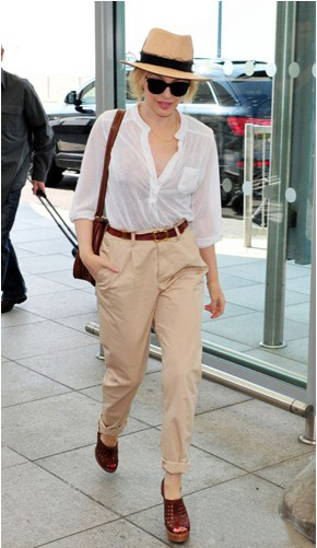 摩登俏皮的米色草編禮帽搭配白色罩衫和哈倫褲,包包,腰帶和鞋子的顏色接近,全身色調(diào)協(xié)調(diào)統(tǒng)一!整體搭配既有小爵士風(fēng)格又不失華麗的小女人韻味。www.hzyichun.com 帽子廠家