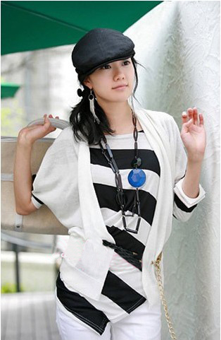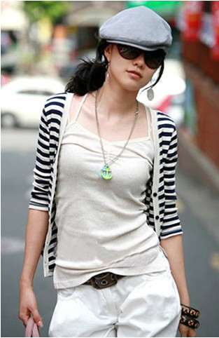03 黑白條色經(jīng)典裝扮給黑色貝雷帽以完美的色彩氛圍,充分展現(xiàn)女性的柔媚